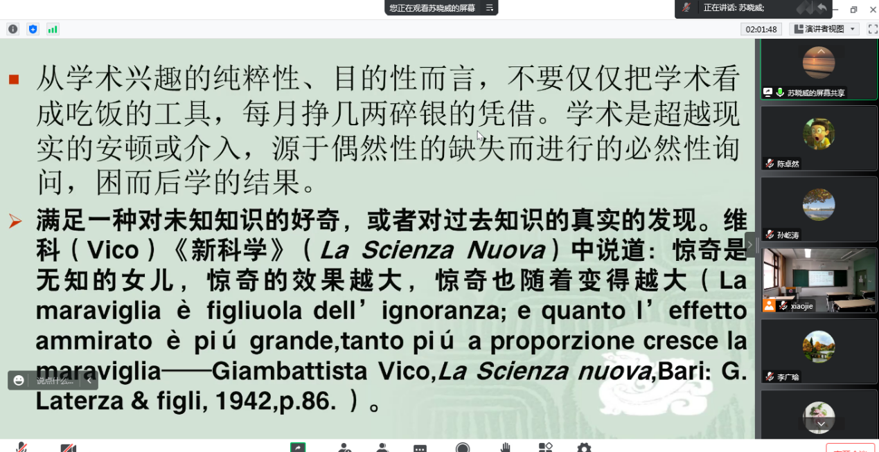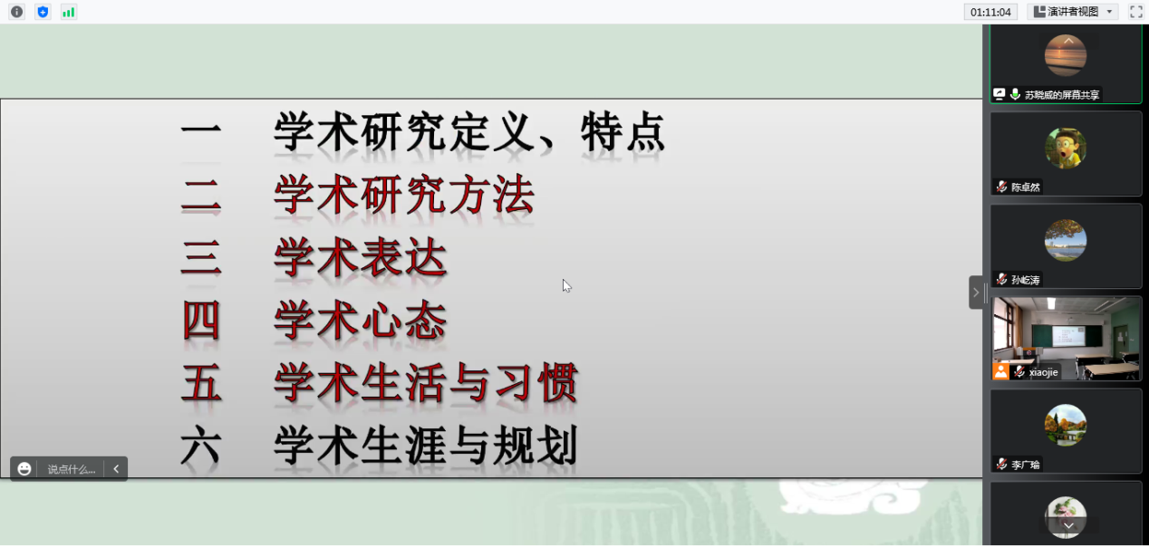 分享结束后,老师们展开了积极讨论,表示苏老师的报告展示出一个读书人对学术的热爱。励智老师说,苏老师的讲座生动地讲述了自己的学术研究心得,将学术研究比喻成一场苦恋,对我们青年教师启发很大,让我对将来的学术生涯规划有了更清晰的认识,坚定了学术信念。林海清老师说,我对苏老师对学术那种发自内心的挚爱感同身受,同时,也由衷地感知到恪守初心、潜心学术的弥足珍贵,以及一路与之相伴的,至高、满足的幸福。陈卓然老师表示,在侃侃而谈中,苏老师清晰的思路、活泼的语气让人感觉到朝气,又不缺少学者该有的睿智与冷静。此次专题讲座的内容引人深思,学术心态、学术习惯的分享让我更加深刻的认识到,学术研究应甘做铺垫之事,多积跬步之功,怀抱孤独沉静之心态。