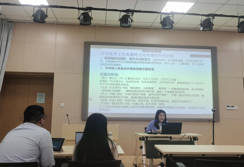 毛可馨同学详细介绍了德尔菲法的研究过程,分析其创新点,探讨中国教师对跨文化能力概念的共识;张媛媛以传播学理论文章为例,就数据引用的研究方法进行了分析,探讨该文献的实用价值和知识价值;来自印度尼西亚的许家鑫同学着眼于中印尼雅万高铁项目,分析媒介素养对驻外员工的跨文化适应的影响;邢丹璞同学从实证研究的方法入手,梳理短期来华职工文化智力、自我效能感和跨文化适应三者关系;张晗钰同学介绍了跨文化交际能力的理论基础:Gudykunsts焦虑/不确定性管理(AUM)理论,为同学们开拓了视野;任聪慧同学深入分析了目的语环境下汉语学习者的跨文化敏感度与效能感这两个层面的内部差异与相互关系,为同学们提供了更多思路。