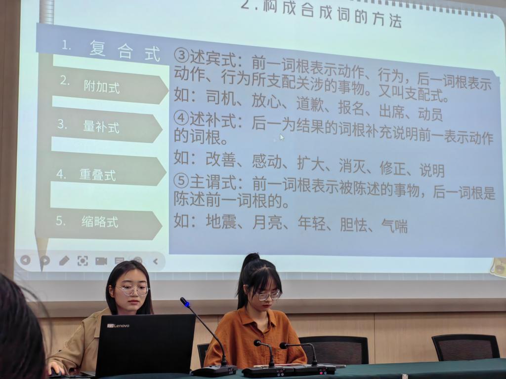 杜雨轩同学介绍了语素教学建立的背景和目前的发展情况,并以三条论据阐明了语素教学的必要性;王洋同学借邢红兵先生的偏误分析再次重申了语素教学的重要性,并讲解了语素的定义、确认方法以及四种分类。阮映月同学简要地介绍了词根、词缀、类化成分三类常用语素,并分享了选用常用语素时应考虑的各类因素;曹晶晶同学结合黄廖版《现代汉语》,以充足的例子介绍了构成单纯词、合成词的各种方式,并就合成式构词法频率分布进行了分享;阮科妙英同学介绍了各种构词法由语素义导出词义的不同途径,并基于她自身的个人经验,认为缩略式构词法属于语法教学中的重难点。刘清桐同学就“生词表在语素教学中的应用”这一创新性探索进行了介绍,并认同生词表教学潜移默化促进员工学习汉语构词规律和词义构成规律时所发挥的作用;张华梅同学介绍了不同学习阶段的语素教学安排;陈氏燕同学结合实际,列举了“语素教学”的四种练习方式。