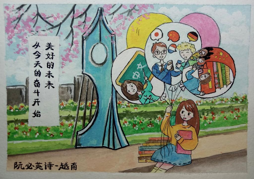 同学们发挥自身特长,设计制作“中文与我的未来”海报作品,录制短视频,以通俗易懂、生动形象的方式分享自己的故事,展现了他们对中文的热爱和对中国的美好祝愿。经过评选,本二2班的杨丽珊(泰国)获得一等奖;本二1班的乔凯琳(英国)、裴武宝玉(越南)和本二2班的阮必英诗(越南)获得二等奖;进修A班的方佩璇(马来西亚)等五名同学获得三等奖;本一1班的范工青玄(越南)等10名同学获得优秀奖。
