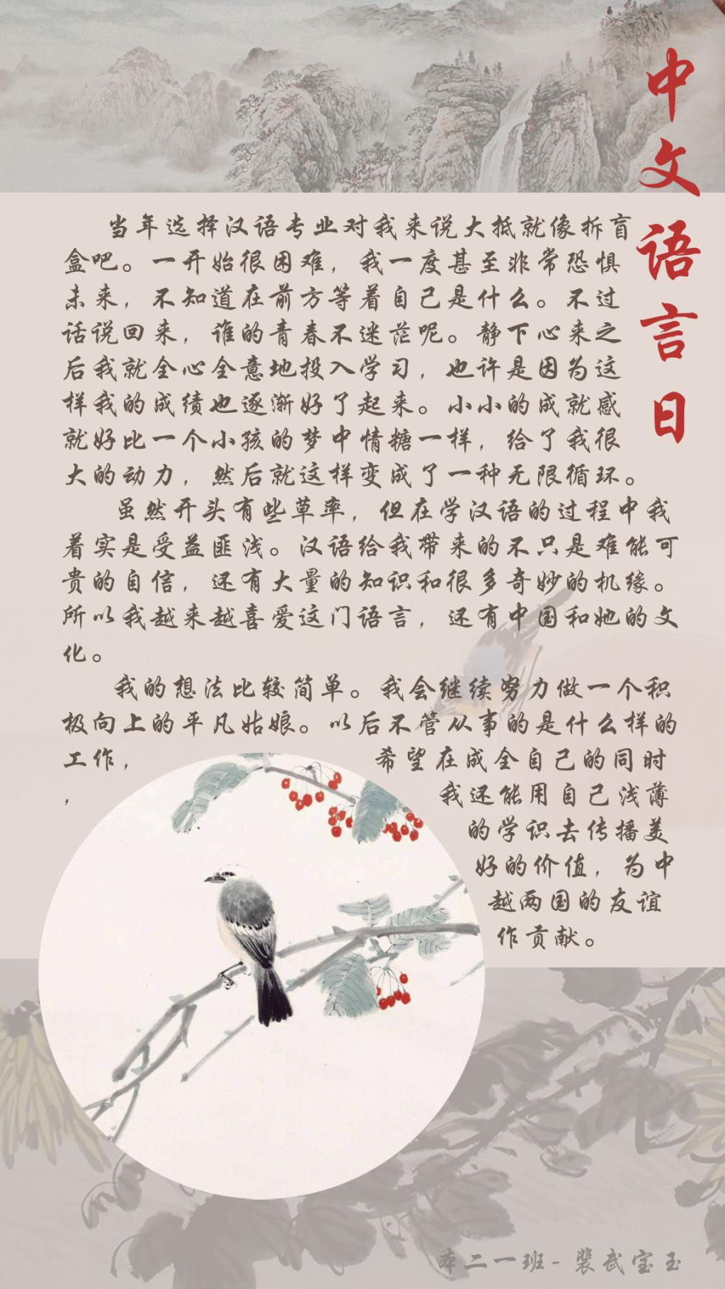 本次比赛面向公司全体国际员工,以本科班和进修班中文阅读课为依托,以“中文与自己的未来”为主题,国际员工们以图文并茂的形式讲述中文与自己的不解之缘,展现国际中文教育为国际员工带来的良好机遇。教师通过课文《联合国中文日》,向员工们介绍国际中文日的由来。从仓颉造字到二十四节气,员工们在理解文章内容的基础上,云端体验中国汉字文化,分享交流自己的中文故事。来自泰国的陈昌立说,“我在学习中文这条路上的引路人就是妈妈。每年公司放假,妈妈都会让我跟着老师学中文。大学毕业之后,我想成为一名中文老师,给泰国员工教授中文,传播中国文化,让更多的泰国人学习和了解当代中国。”来自乌克兰的叶欣说,“我上大学时,课余时间在中餐馆打工,厨师是中国人,这是我第一次接触中国语言和文化。我对他讲中文时音调的抑扬顿挫很好奇。同时看他写汉字时一笔一划,像画画一样,也很感兴趣。正因为如此我才有了巨大的动力,克服重重困难努力学习中文。”来自越南的徐笑兰说,“2018年是我第一次接触中文。我有机会听到了一首歌《是你It'syou》,这首歌让我慢慢开始对中文感兴趣。学习中文就是我人生路上一段长长的台阶,通向我想要的未来。”来自亚美尼亚的郭哈儿说,“能与中国相守相识,是我的幸运,这份幸运来之不易。在我心中,中国是地图上特别大的一个地方,中文是一门博大精深的语言。我希望在未来我也能继续和中国保持联系。我想当一名中国通,成为连接亚美尼亚和中国的纽带。如果运气再好一点,我甚至还想在中国邂逅我未来的另一半,这该是多么美好和浪漫呀!”