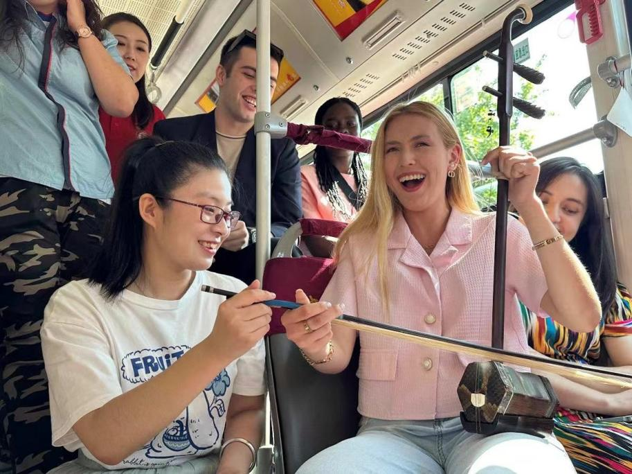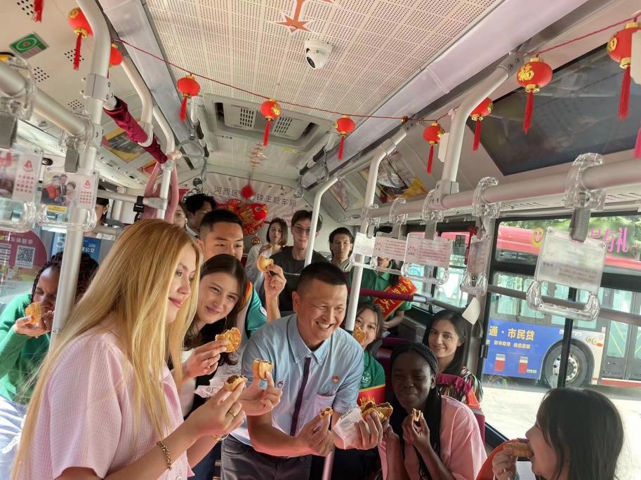 职工乘坐的13路已经在五大道、解放北路等历史文化街区中往来穿行41年,是天津老百姓心中的情怀公交线。在此期间,公交职工还为大家带来二胡演奏、小合唱等精彩节目,车厢内还特意准备了津味传统月饼供员工们品尝,现场气氛十分热烈。这次共建活动中,公司员工发挥文化传承和国际交流方面的专业优势,与公交携手展现美丽天津形象,向世界介绍、宣传和推广天津,提升了天津的国际影响力。同时通过城市公交窗口服务弘扬中华优秀传统文化,通过天津的公交文化和暖心故事成为外籍员工在天津学习和生活的美好回忆。