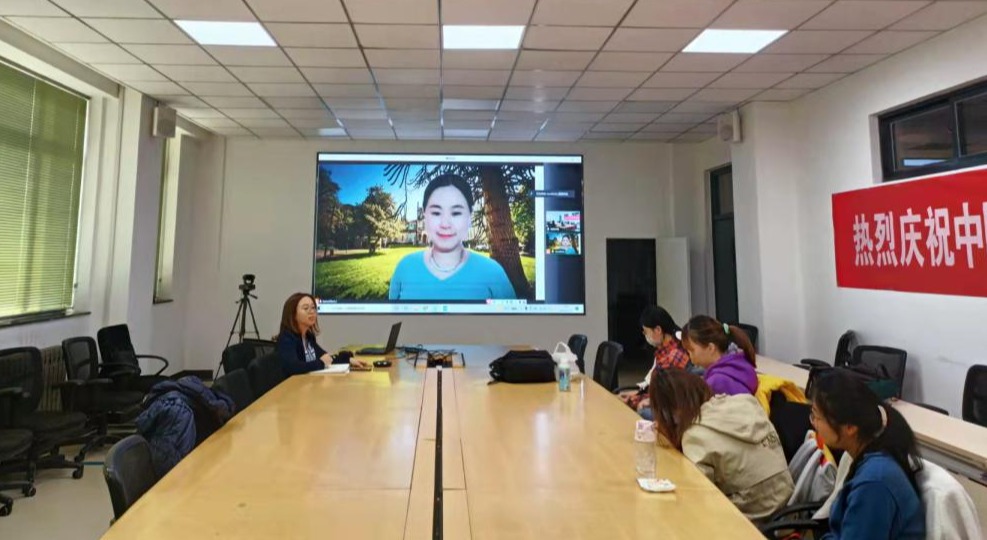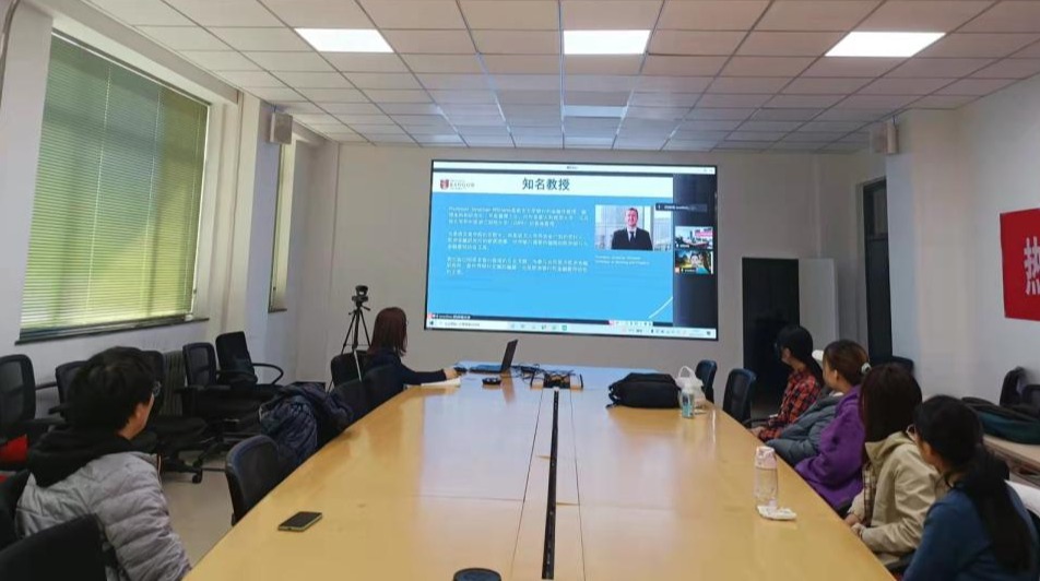 随后,现在英国留学的2017级优秀员工代表王俞含在线向同学们分享了自己经历。首先,她讲述了出国留学的优势与意义,并结合专业领域与国际形势,从多个角度分享了前期准备的注意事项,介绍了在国外的日常生活经历,特别是在班戈大学学习的体会、感悟与收获。