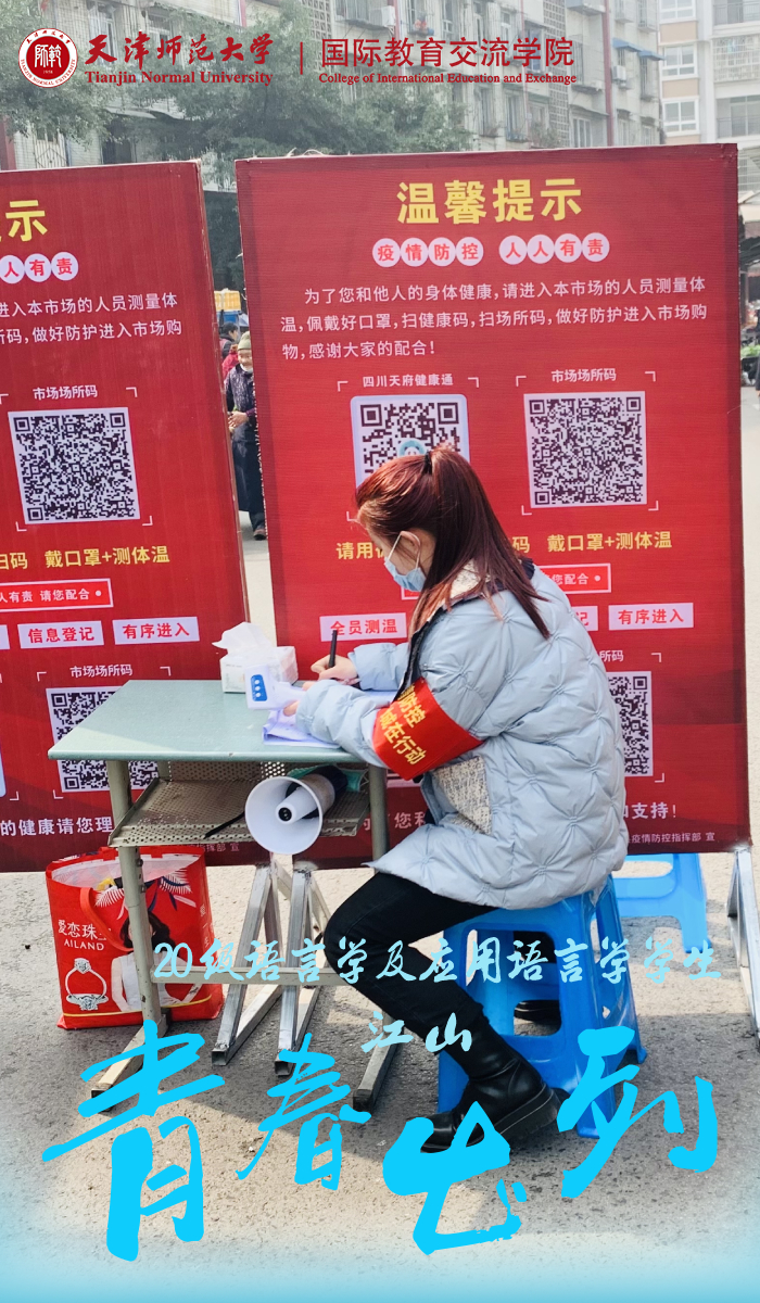 临近年关,今年的疫情依然严峻,来自四川乐山的2020级语言学及应用语言学专业硕士江山同学赶紧联系了当地相关部门的负责人,希望为家乡的联防联控工作献出自己的一份力量。江山和工作人员一起在人员流动大、防控任务重的菜市场入口处,协助大家扫健康码和场所码以及登记体温信息。由于菜市场里面以中老年人为主,很多人不太擅长使用智能手机或没有手机,江山就帮助他们操作手机和填写纸质版的温度登记表。虽然自己在家乡参与志愿服务,但天津的疫情一直记挂在江山的心里,已经连续两年利用假期时间参加志愿服务的江山更加明白志愿者工作的意义。她说,志愿路上,有你有我,每个人做自己能做的、应该做的,虽然微小但也可以照亮他人,我将随时为大家服务,以实际行动不断向党组织靠拢。天津的伙伴们加油,我相信天津一定可以战胜这次的疫情!