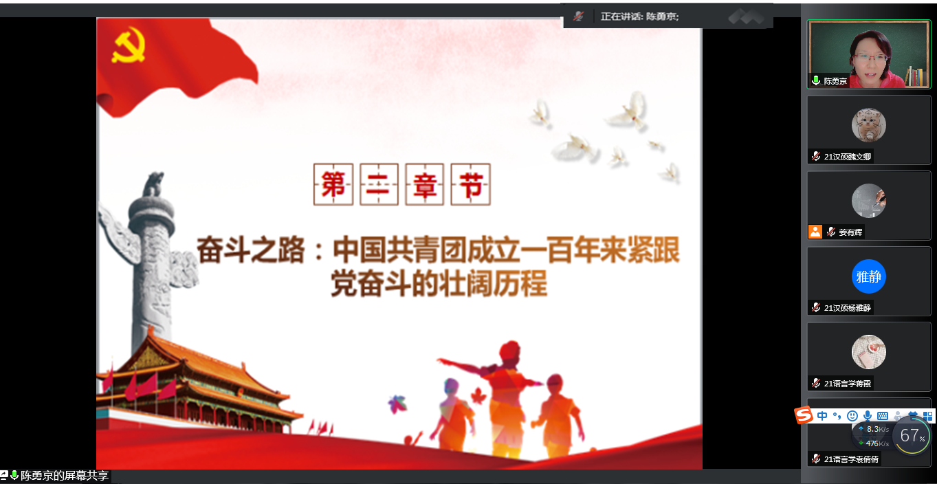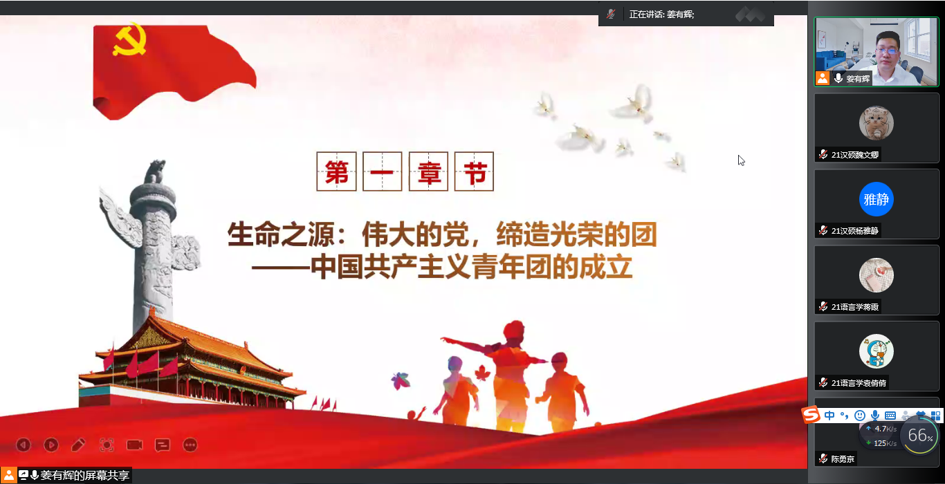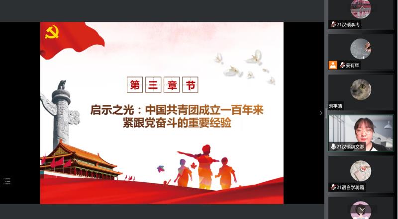 以史明志,继往开来。院团委副书记陈勇京老师从“新民主主义革命时期”的开天辟地讲到“中国特色社会主义时代”的惊天动地,细细讲解了中国共青团成立一百年来紧跟党奋斗的壮阔历程,鼓舞团员青年们积极参与党史学习,响应党的号召,勇做走在时代前列的奋进者、开拓者、奉献者。