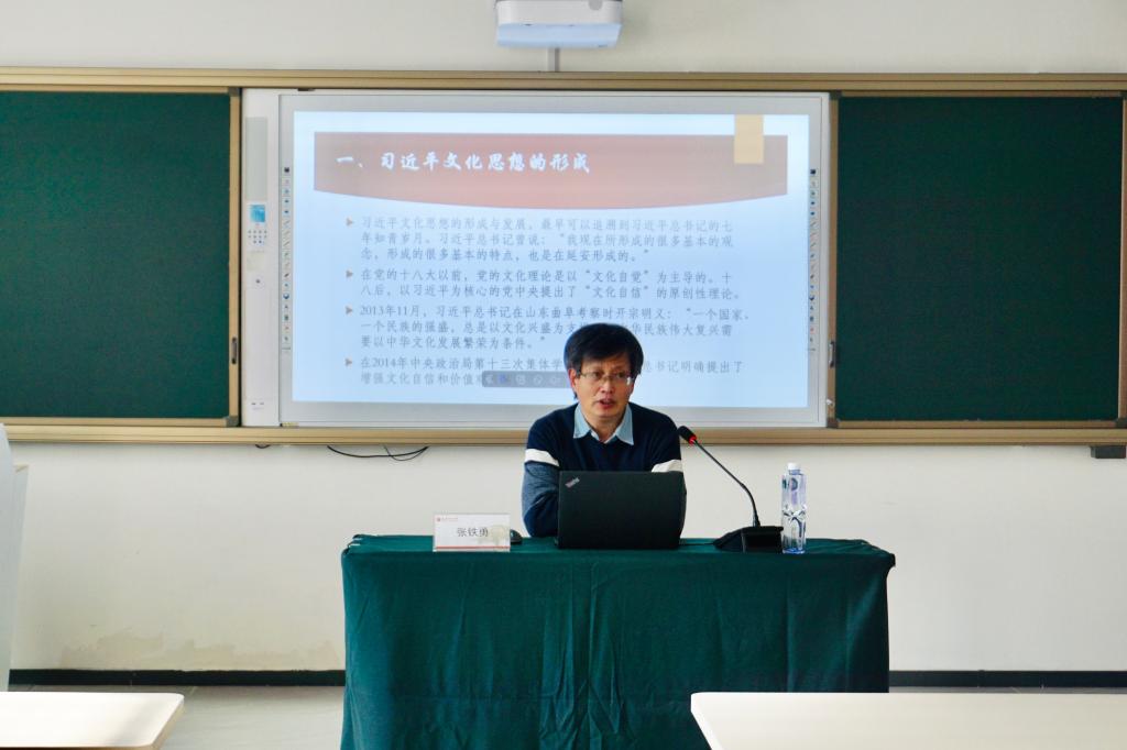 为全面贯彻落实党的二十大关于文化建设的战略部署,贯彻落实习近平总书记关于宣传思想文化工作做出的重要指示和全国、我市宣传思想文化工作会议精神,深刻学习领会习近平文化思想的重大意义,更好地坚定文化自信、秉持开放包容、坚持守正创新,12月28日,国际交流党委邀请马克思主义公司教授、博士生导师张铁勇作题为“学习习近平文化思想,为建设文化强国贡献智慧和力量”的专题报告。国际交流党委书记张卫军主持,全体教职工参加。