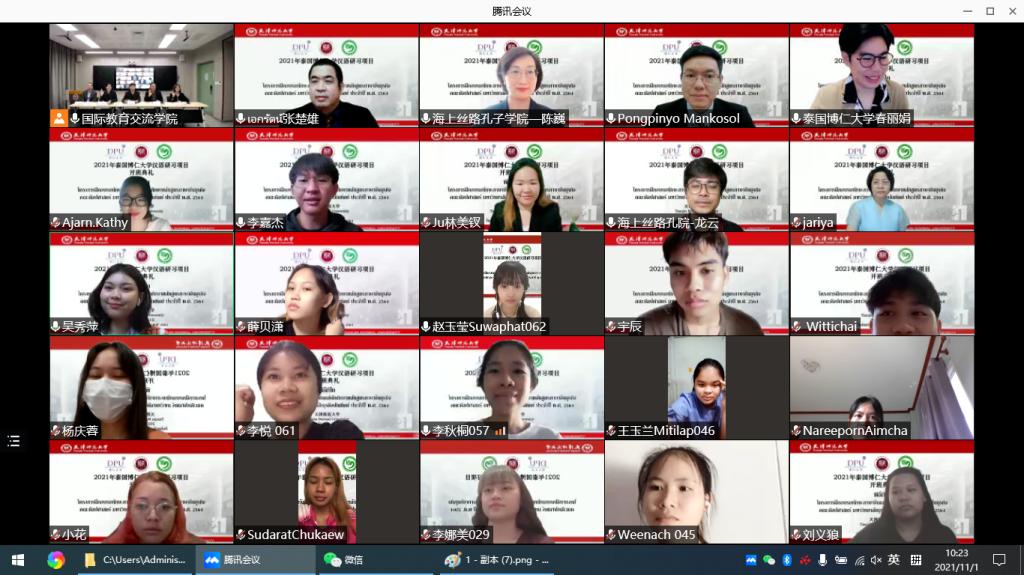 11月1日,2021年泰国博仁大学汉语研习项目开班典礼在线上举行。泰国海上丝路孔子公司外方经理张楚雄、中方经理陈巍,泰国博仁大学人文公司经理彭斌优·曼歌松、经贸中文系主任林美钗,公司职工管理服务中心主任潘红岩、体育365官网经理赵雅文,以及泰国博仁大学、公司国际交流处、体育365官网相关教师和153名汉语研习项目成员参加典礼。