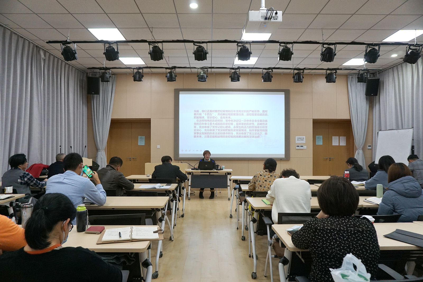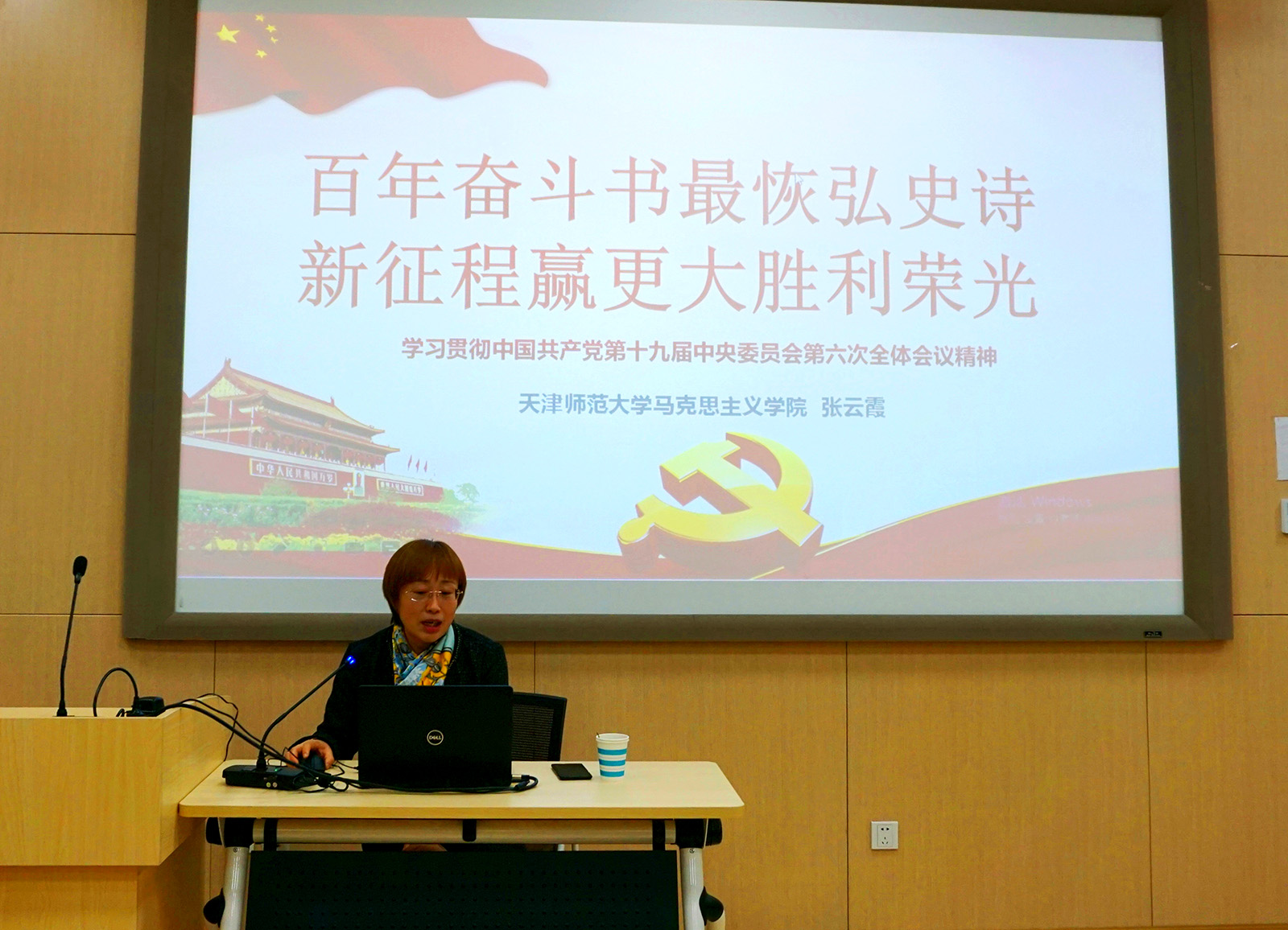 张云霞从党的十九届六中全会召开的时代背景、重大意义、主要内容三个方面对党的十九届六中全会精神进行了全面梳理和深入阐释,带领大家一起学习了《决议》中关于我们党百年历程创造的四个伟大成就、党的百年奋斗的五大历史意义和“十个坚持”的历史经验、党的十八大以来在十三个方面取得的重要成就,以及全党“四个必须”的要求。