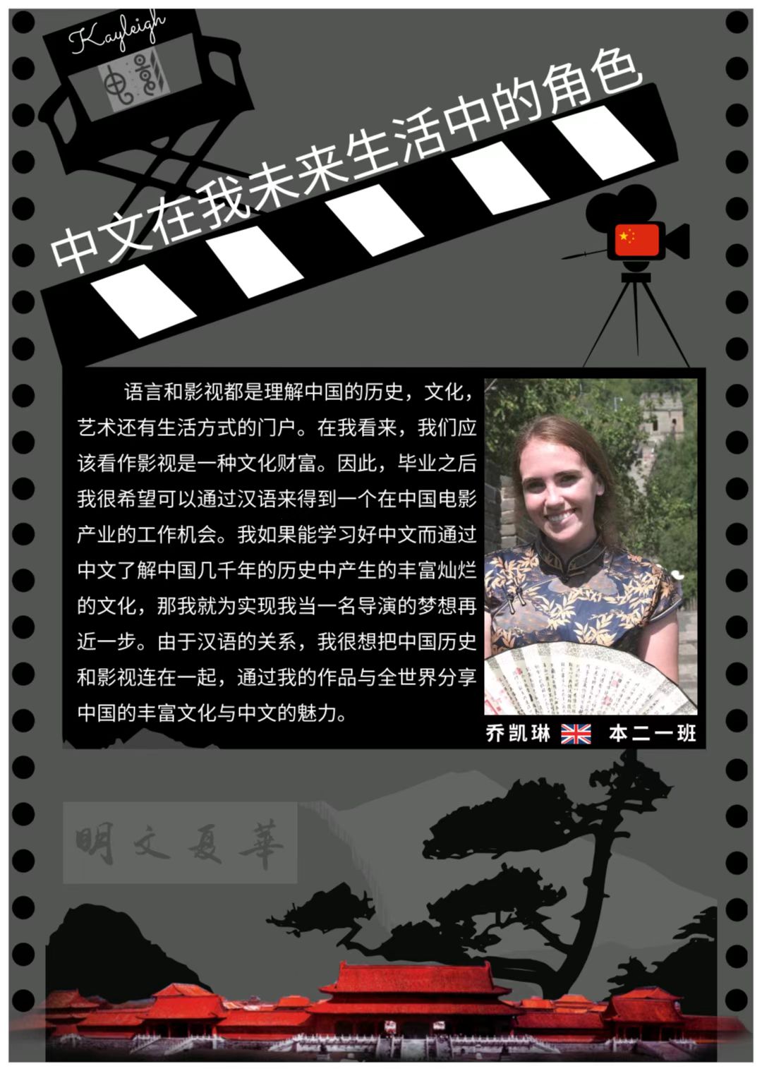 同学们发挥自身特长,设计制作“中文与我的未来”海报作品,录制短视频,以通俗易懂、生动形象的方式分享自己的故事,展现了他们对中文的热爱和对中国的美好祝愿。经过评选,本二2班的杨丽珊(泰国)获得一等奖;本二1班的乔凯琳(英国)、裴武宝玉(越南)和本二2班的阮必英诗(越南)获得二等奖;进修A班的方佩璇(马来西亚)等五名同学获得三等奖;本一1班的范工青玄(越南)等10名同学获得优秀奖。