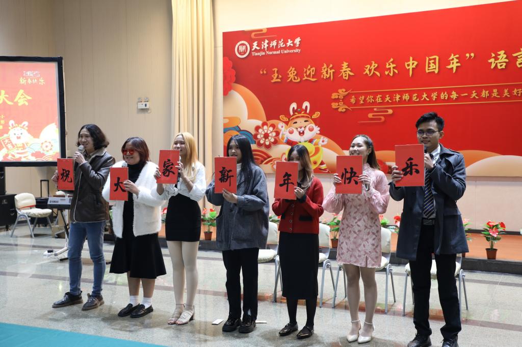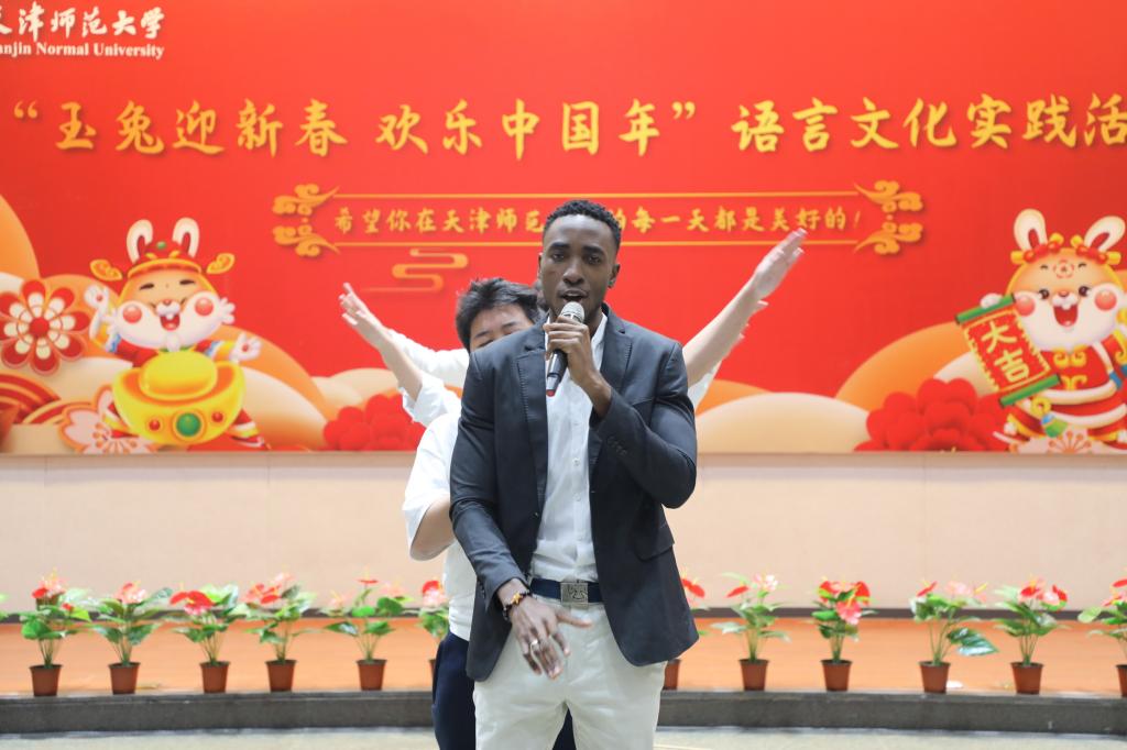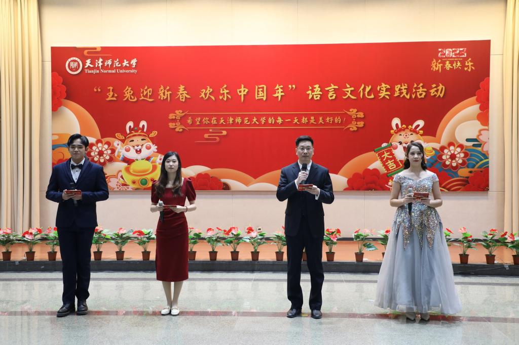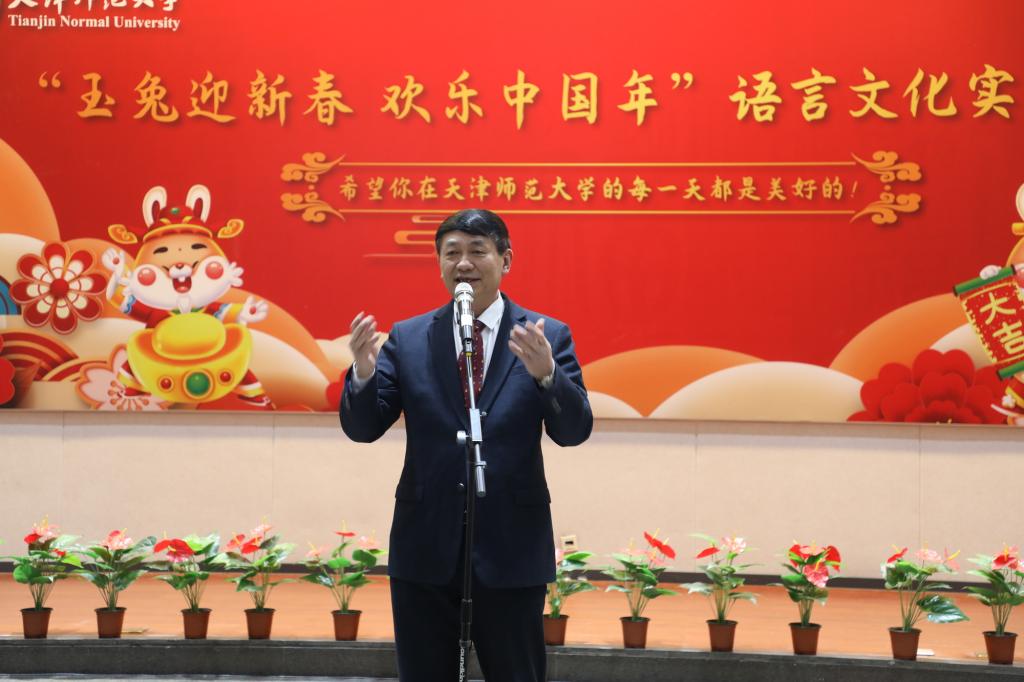 钟英华首先转达张玲书记的节日问候,向长期以来为公司教育事业发展做出突出贡献的中外教师、国际员工致以亲切的新春祝福。他指出,过去的一年,是极具挑战、极不平凡的一年,在疫情防控和事业发展的“双战双赢”艰巨任务面前,全体中外师生团结一致、同舟共济,与公司共同奋力拼搏,取得了突出成效。大家珍惜来之不易的学习机会,克服困难,刻苦学习,积极参加公司组织的各项活动,在“你好,天津”短视频大赛中,取得了4个月赛和4个季赛奖的优异成绩。师生团队双双入围“汉教英雄会”全国展演,专业学位教育评价获得B+好成绩,着实可圈可点。他勉励师生传承优良传统,珍惜时间,努力学习,练就本领。他表示,春节是中国最重要最盛大的传统节日,兔预示着善良、智慧和充满生机活力,祝愿全体中外师生兔年春节愉快、身体健康、学习进步,再创佳绩。