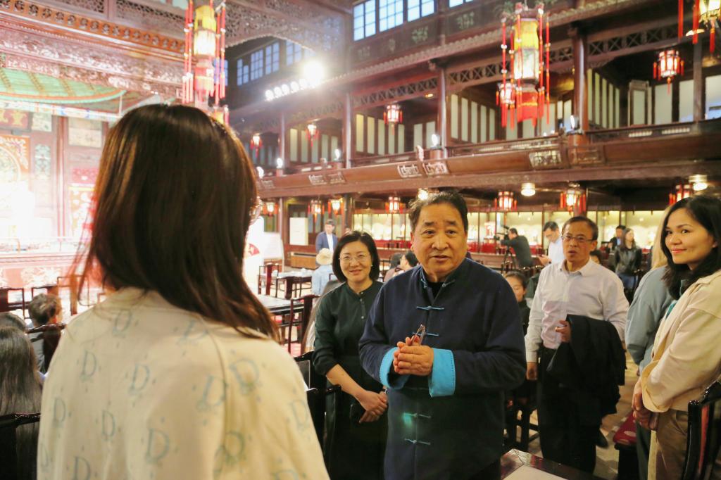 演出开始前,姜昆老师来到观众席看望中外员工相声爱好者。他鼓励员工们学会多多欣赏相声“韵味”,体验蕴含在“相”与“声”里的中华文化传统。