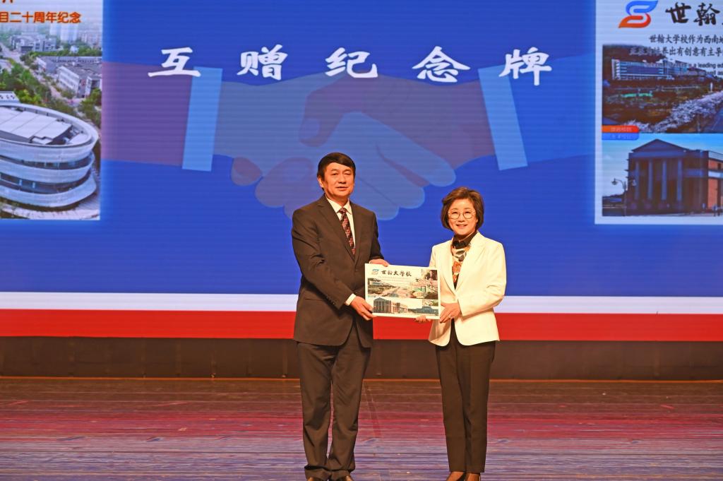 两校互赠纪念牌,希冀中韩合作办学硕士研究生项目在新时代焕发新的风采,为中韩友好合作培养更多有用人才,为中韩友好作出新贡献。