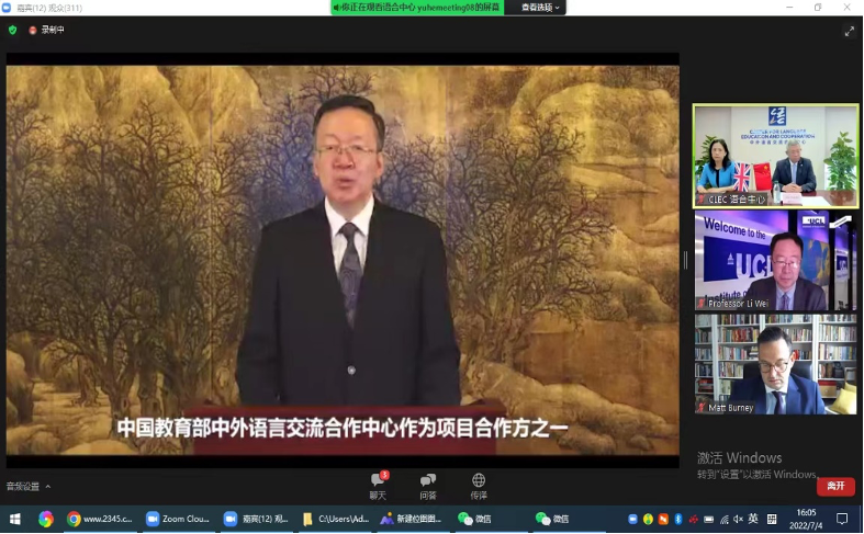 7月4日,2022年“汉语桥”英国“中文培优”项目员工夏令营开幕式在线上成功举行。中国教育部副部长田学军、英国教育部公司事务部长罗宾·沃克(Robin Walker)、英国驻华使馆文化教育公使/英国文化教育协会中国区主任包迈岫(Matt Burney)、伦敦大学公司教育公司经理李嵬出席并致辞,公司国际交流处、体育365官网相关领导和师生通过ZOOM平台与来自英国64所培优公司和中国其他15所访华研修承办院校的近2000名师生参加开幕式,开幕式由中外语言交流合作中心主任马箭飞主持。