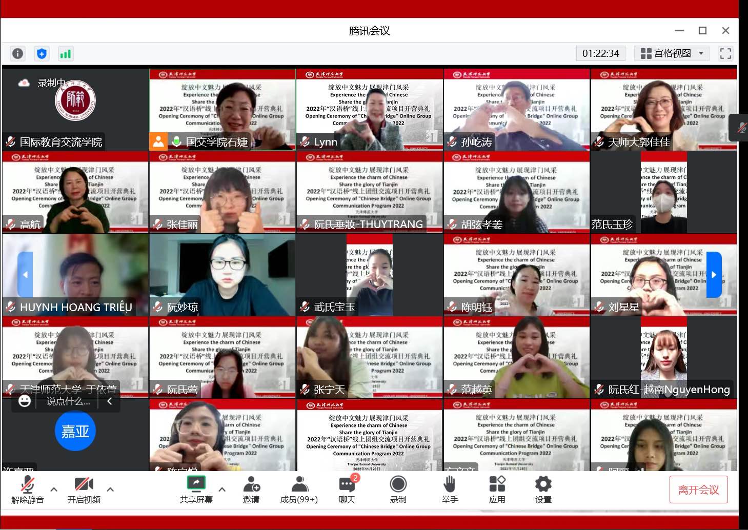 为深入贯彻党的二十大关于增强中华文明传播力影响力,讲好中国故事、传播好中国声音,展现可信、可爱、可敬的中国形象的重要部署,11月28日上午,“绽放中文魅力,展现津门风采”2022年“汉语桥”线上团组交流项目,通过腾讯会议举行了开营仪式。公司国际交流处副处长张琳、体育365官网副经理高航以及来自泰国、越南、肯尼亚、印度、巴基斯坦、阿富汗等8个国家的200余名学员相聚云端,在线上参加了开营仪式。开营仪式由公司党委副书记石婕主持。