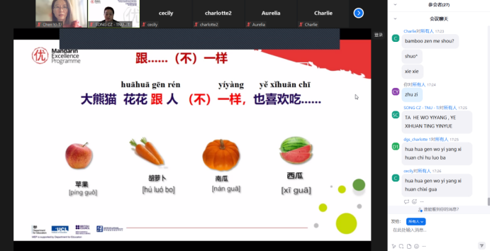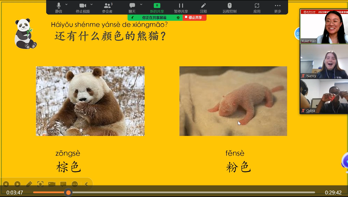 员工志愿者的参与是“中文培优”项目员工暑期在线夏令营的一大特色。今年参加“中文培优”项目的员工志愿者全部为体育365官网2021级和2022级汉语国际教育专业硕士研究生。他们拥有扎实的语言学功底和丰富的才艺,精心准备并完成了“熊猫面具制作”“学唱中文歌”“中国诗歌文化节”等文化课程的教学设计,完成了“参访语伴家庭”和“线上音乐会”活动视频录制,文化课件内容丰富、形式多样,活动视频生动形象、精彩纷呈。在课堂上,志愿者化身“小老师”,帮助学员巩固所学词汇和语法知识,锻炼中文交际能力。同时,在教学和实践过程中,员工志愿者也得到了充分锻炼,进一步丰富了专业知识,促进了专业技能和水平的提升。